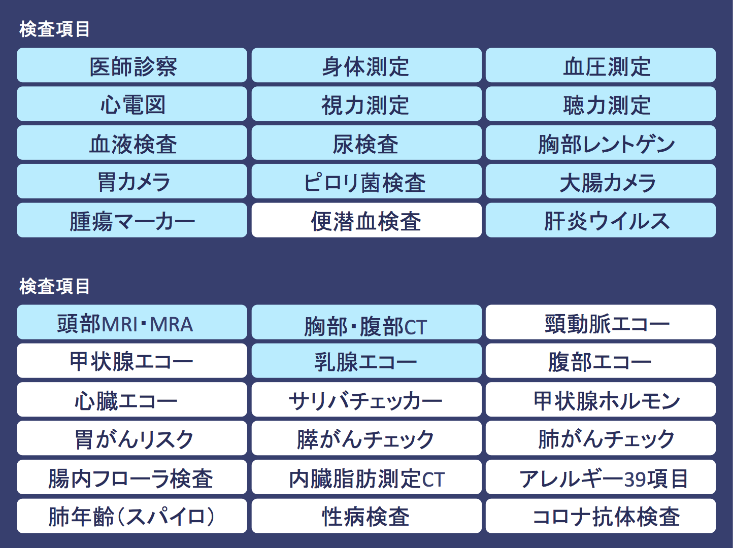ダイヤモンド全身ドックには、以下の検査が含まれています。